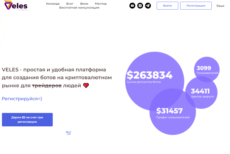 Veles Finance — платформа для создания торговых ботов на рынках Binance Spot, Binance Futures, и Binance Coin. Предлагает тонко настраиваемый инструментарий для автоматического размещения торговых ордеров. В отличие от большинства известных ботов, Veles ориентируется не на профессиональных трейдеров, а на рядового пользователя криптовалютных бирж, поэтому интерфейс программы минималистичен и удобен в использовании. Вся работа проходит через интерфейс сайта. Для работы с Veles Finance навыки программирования и работы с командной строкой не требуются. Представлено три торговых робота с возможностью индивидуальной настройки. Возможность торговли "вручную" в Veles Finance не предусмотрена. Приведем пример работы: Открыта сделка на покупку. Цена падает и сделка уходит в минус. Ниже, на определенной заранее цене, бот открывает новую покупку, усредняя первую. Средняя цена по обеим сделкам оказывается ниже, чем цена по первой. Если цена пойдет еще ниже, бот откроет еще одну покупку, занижая ср