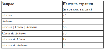 В языке запросов поискового сервера для обозначения логической операции «ИЛИ» используется символ «|», а для обозначения логической операции «И» –– символ «&». В таблице приведены запросы и количество найденных по ним страниц некоторого сегмента сети Интернет. Какое количество страниц (в сотнях тысяч) будет найдено по запросу Слон? Считается, что все запросы выполнялись практически одновременно, так что набор страниц, содержащих все искомые слова, не изменялся за время выполнения запросов. РЕШЕНИЕ Изобразим на диаграмме имеющиеся данные: Отметим область, которую нужно найти: Ладья + Слон + Хобот - Ладья И Слон - Слон И Хобот = Ладья ИЛИ Слон ИЛИ Хобот Слон = Ладья ИЛИ Слон ИЛИ Хобот + Ладья И Слон + Слон И Хобот - Ладья - Хобот = 12 + 20 + 66 - 25 - 28 = 45 ОТВЕТ 45