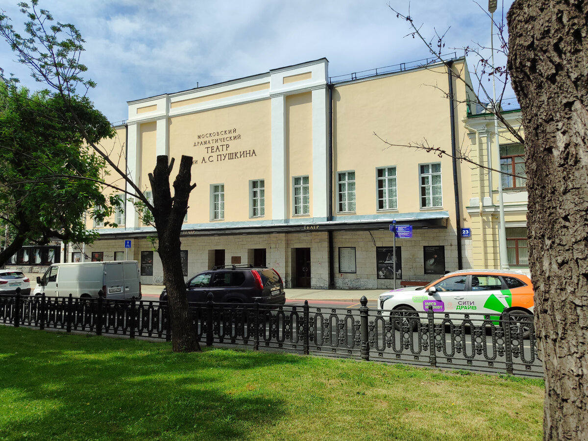 «С екатерининских времен украшает Тверской бульвар дом № 23». - Что это за дом такой?- начал морщить лоб читатель. Так же как и я. Прочитав эту фразу. Тысячу раз мимо проходили. А многие и внутрь заходили. Театр им. Пушкина. Ну да. Аккуратно покрашен. Но насчет украшения- слишком сильно будет. А ведь это старинный особняк. Конца XVIII века. Среди владельцев дома значатся тайный советник, князь И.А. Вяземский, Дмитриевы-Мамоновы, П.А. Кологривов. О княжеской усадьбе теперь мало что напоминает. Одно успокаивает- раньше еще хуже было. Когда тут театр "Камерный театр" Таирова был. Вообще все лишнее убрали. В соответствии с новаторскими взглядами руководителя театра. Зато недоделанную конструкцию башенного крана к фасаду прилепили. Камерный театр Таирова обосновался здесь в 1914 году. Как-то не сложилось у Александра Яковлевича в «Свободном театре». Решил свой организовать. Стал искать помещение. Выбрал этот особняк. Жена подсказала. Мол, ее «давно привлекал один особняк с красивой дверью и