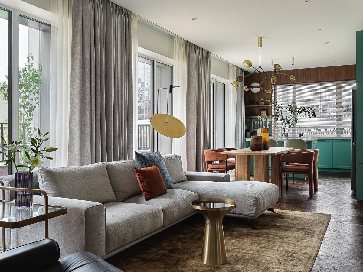 Молодые супруги с ребёнком и кошкой обратились в студию Mediana Interiors. У клиентов было чёткое представление о том, каким они хотят видеть своё жильё. Они подробно описали свой образ жизни, времяпрепровождение, хобби и предпочтения в обстановке. Заказчики отвергли стандартные белые и серые тона в пользу насыщенных оттенков, характерных для середины XX века. Супруги хотели получить яркий и комфортный дом с индивидуальным декором и удобной планировкой. Первоначально квартира была пустым пространством с двумя колоннами, двумя блоками коммуникаций и множеством окон. После работы над планировкой получились следующие помещения: прихожая, гостевой санузел, детская комната, просторная кухня-гостиная, отдельный блок для хозяев, включающий спальню, большую гардеробную и ванную комнату. При создании концепции использовались различные цветовые комбинации, но основными стали оттенки синего и бирюзового, а также цвет американского ореха. Кроме того, в каждой комнате присутствуют дополнительные
