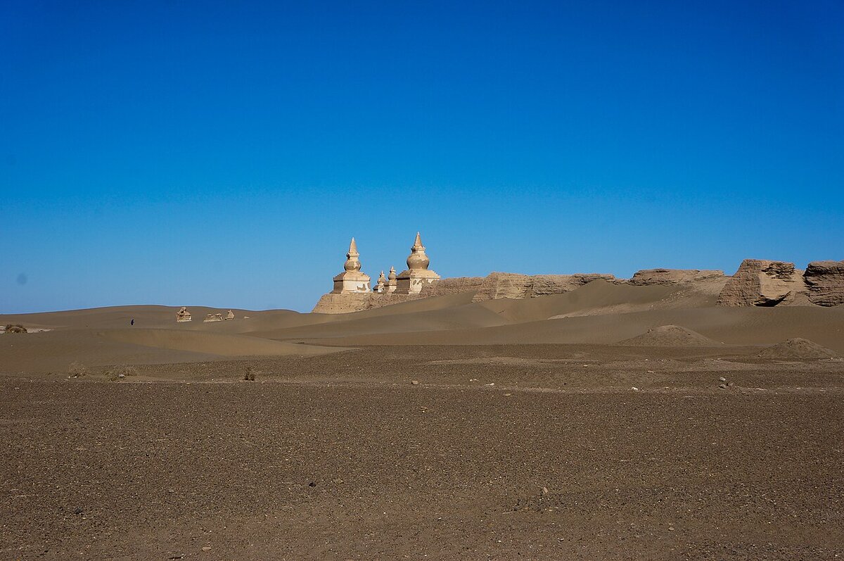 Перед путешественниками предстала высокая крепостная стена, образующая по периметру квадрат. С западной стороны возвышались два субургана (мавзолея), один из которых был разрушен почти полностью. Стены, кроме западной, до самого верха занесло песком.