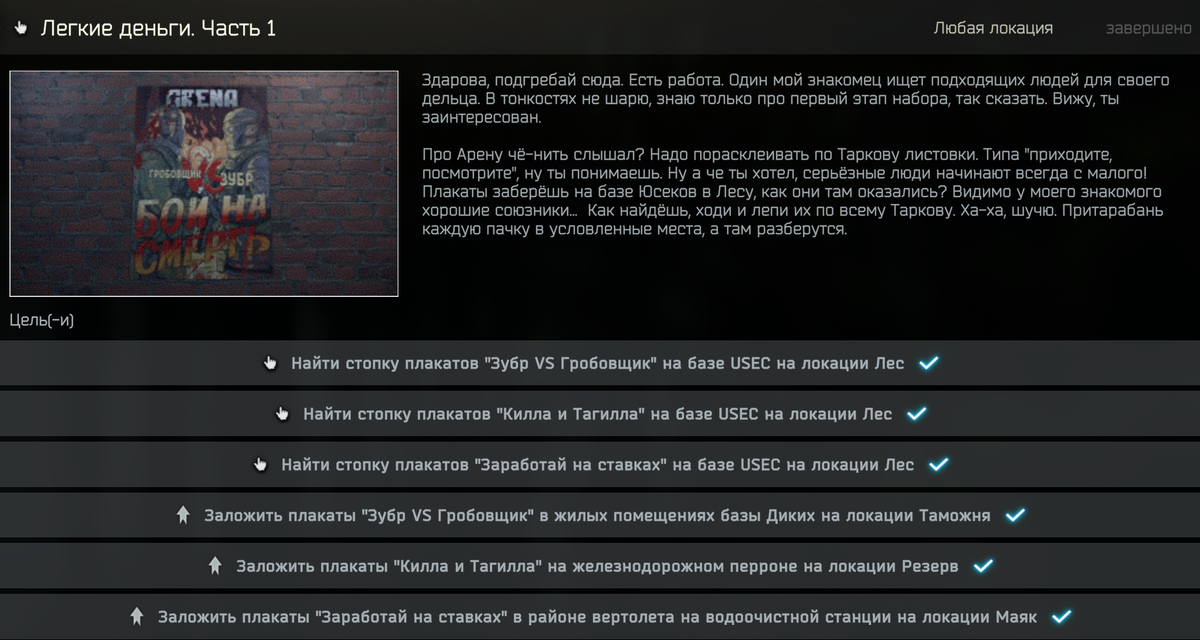 Первое задание (открывающие Рефа) выдаст Лыжник Легкие деньги. Часть 1 Направляемся на карту Лес, в лагерь USEC и подбираем 3 плаката: Эта палатка в другой части лагеря, у 2х автомобилей Теперь журналы нужно заложить на 3х картах: ***Важный совет! Прежде чем направится на расклейку плакатов, оставь "лишние" в схроновом инвентаре крестовых предметов и бери по 1 за раз, так в случае смерти, ты потеряешь только один плакат (а не все). Выйдя с журналами с карты, откроется новый торговец и дальнейшие задания будет выдавать лично. Легкие деньги. Часть 2 Водку "Тарковская" и "Певко светлое" можно скрафтить в пищеблоке, если первую найти не сложно, то раздобыть 7 бутылок пива будет очень не просто. Сушеное мясо Tarker придется искать, в процессе попадаться и плитки шоколада Аленка В момент появления задания, больше всего мяса можно раздобыть на карте Эпицентр. Посети две комнаты у АГСа и ниже. Дальше проверяем кафе, что напротив пулемета (оба этажа). Плюс ресторан у выхода с зеленым фа
