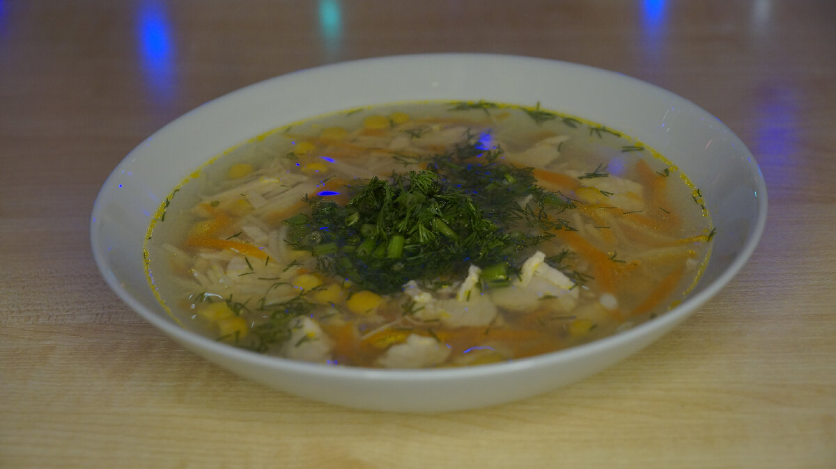 Ингредиенты: · вода – 1200 мл.; · филе куриной грудки – 2 шт.; · морковь – 1 шт.; · кукуруза – 1 банка; · черный перец горошком -10 шт.; · вермишель – 50 гр.; · соль – 6 гр. Приготовление: Для начала следует сварить бульон: в воду положить черный перец, дать закипеть, посолить и положить куриную грудку. Снова дать закипеть, варить полчаса. Морковь очистить, потереть на терке. Курицу достать, порезать на небольшие кусочки, вернуть в бульон вместе с морковью, варить 15 минут на среднем огне, затем положить вермишель, варить еще 5 минут, положить кукурузу (предварительно слив воду из банки), выключить плиту. Приятного аппетита!