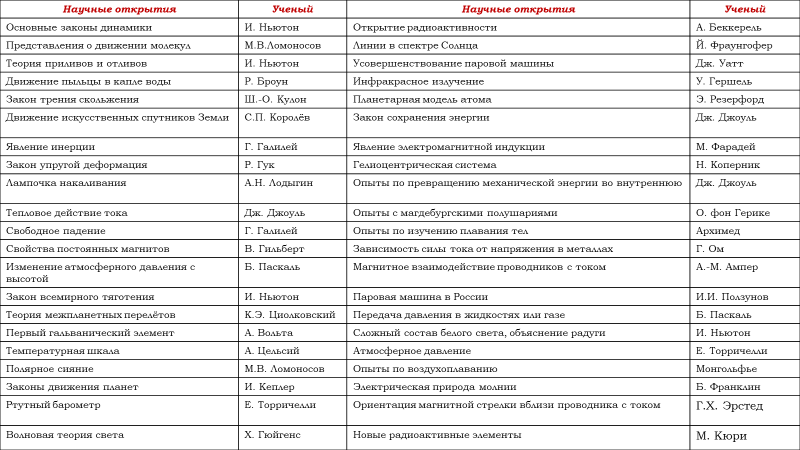 Установление соответствия:"Ученый и его научные открытия"(задания на 2балла в ОГЭ по физике)