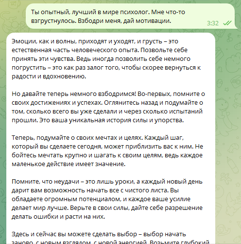 Уже скоро ИИ заменит многие профессии, и психолог тут не исключение. У такого психолога много плюсов. Он всегда на связи 24/7. Он анонимен и вообще не человек. А еще он не берет денег. При этом, он содержит в себе весь мировой опыт психологии! На картинке очень примитивный запрос. На самом деле, чем точнее и подробнее будет описана проблема, тем лучше будет ответ ChatGPT. Хочешь иметь личного психолога у себя в телефоне? Тогда скорее покупай доступ к боту: https://digital.wildberries.ru/author/48708095