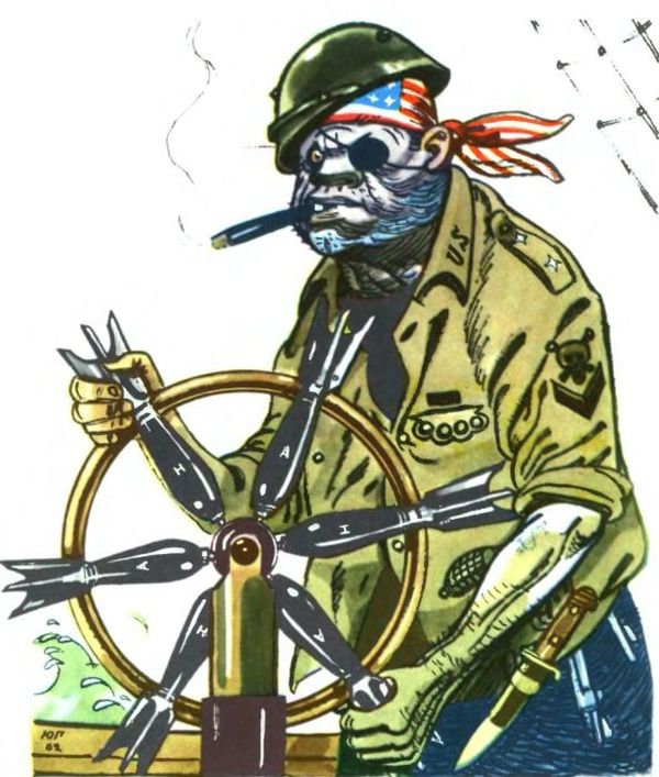 «Добрый дядя Сам. — Я вам, детки, принёс самолётики, пушечки, танки, бомбочки, а вы мне дайте своих солдатиков!» 1950
