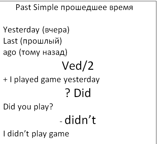 Упражнение 1: раскрой скобки, поставь глаголы в Past Simple We (to play) chess with Tomas yesterday. Natalie (to stay) at the hotel. She (not to know) my address. They (to see) something interesting. I (not to understand) those words. You (to hear) the order. Our parents (not to trust) doctors. Упражнение 2: сделай предложения отрицательными и вопросительными We (to break) the rules. Denise (to share) her Birthday photos. People (not to like) the stranger. I (to say) anything wrong? your aunt (to watch) that movie yesterday? You (not to promise) Danny to help. She (to cut) a sheet of paper. Упражнение 3: глагол to be в Past Simple. Вставь was/were I _ happy yesterday morning My brother _ sick two days ago They _ at the cinema yesterday He _ at school an hour ago Kate _ at the children’s camp last month HOMEWORK Упражнение 1: Раскрой скобки, употреби глаголы в Past Simple Упражнение 2: Сделай предложения отрицательными.