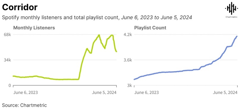 Auxéméry говорит, что среди популярных исполнителей - монреальская инди-группа Corridor и Юбер Ленуар, сольный исполнитель родом из Квебека. Статистика согласуется: за последний год Corridor пережил значительный всплеск популярности Spotify, а ежемесячная аудитория составила около 68 000 человек. Всплеск, по-видимому, связан с увеличением присутствия группы в плейлистах, которое выросло с чуть более 3000 до почти 4200 включений — заметное увеличение примерно на 40%.