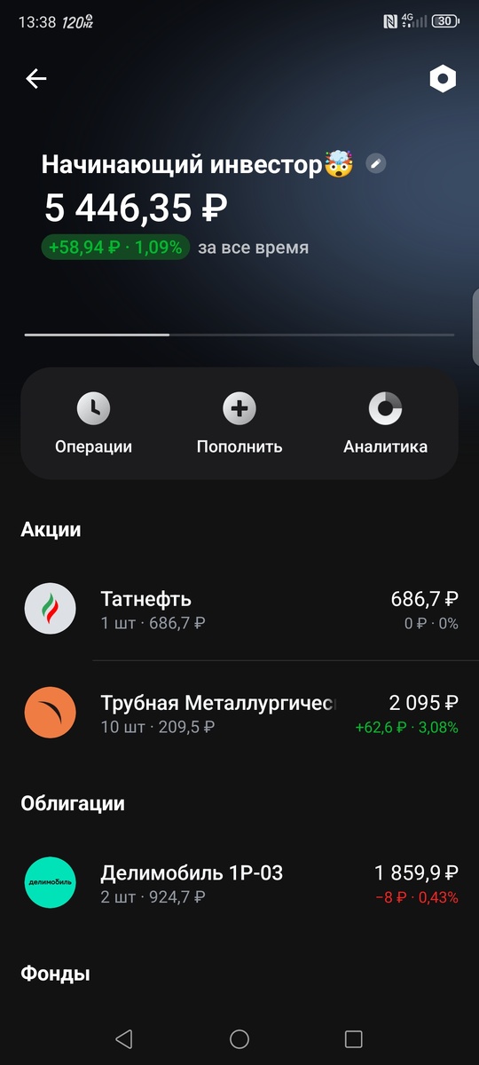 И Так добрый день уважаемые читатели Мой брокер : Сегодня 17.06.2024 Я купил пакет акций Татнефти. И продал 41 лот фонда Тинькофф (TITR) Потихоньку портфель растет TRMK планирую продать по тейк-профилю при достижении 220руб. И так на сегодняшний портфель составляет 5446 руб. Довольно таки неплохо