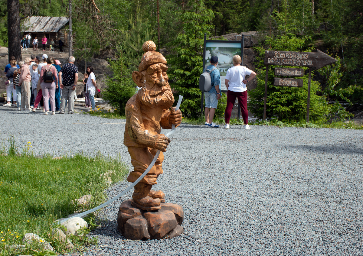 После экскурсии по горному парку Рускеала мы отправились осматривать еще одну жемчужину южной Карелии – водопады Ахинкоски, которые находятся на реке Тохмайоки примерно в пяти километрах к югу от парка Рускеала. Комплекс четырех водопадов обычно называют по имени самого крупного водопада высотой около 4 метров. Но их называют также Рускеальскими по названию местности или Тохмайокскими по названию реки. По поводу происхождения топонима Ахинкоски существуют разные мнения. Некоторые считают, что этот топоним произошел от карельских слов ahven (окунь) и koski (водопад или речной порог). И даже называют эти водопады не Ахинкоски, а Ахвенкоски. Но на старых топографических картах используется именно топоним Ахинкоски (Ahinkoski). Так что гипотеза «окуневого» названия весьма сомнительна, тем более, что окуни вблизи порогов не водятся. Но пусть происхождением названия водопадов занимаются специалисты-филологи. Территория вокруг водопадов хорошо обустроена. Проложены туристические тропы с дерев