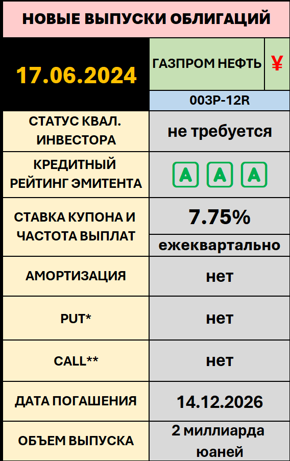 😉 Утро доброе, дамы и господа! Надеюсь, что понедельник порадует нас больше, чем пятничный день... Поэтому с полным воодушевления настроением перехожу к единственной новинке дня! ✅ Юани и нефть - два кита современной реальности. Этот выпуск объединит их: 1️⃣ ГАЗПРОМ НЕФТЬ 003Р-12R (🅰️🅰️🅰️) 🔢 Тикер: $RU000A108PZ2 🔸 Выпуск в китайских юанях 🔸 Имеется возможность купонных выплат в рублях на усмотрение эмитента 🔸 Оферта и досрочное погашение отсутствуют Не уверен, что готов предоставить какие-то дополнительные комментарии к выпуску, так как эмитент в представлении не нуждается, да и ни одного выпуска в китайской валюте в моем портфеле нет. Почему? Исключительно личное мнение заключается в том, что ни в одной валюте, кроме рубля, сейчас уверенным быть нельзя, интересных доходностей на горизонте я не вижу, да и за покупку юаней придется дополнительные комиссии платить. Но в целом, здесь выпуск подразумевает рублевые выплаты, если что, так что большого количества рисков не маячит.