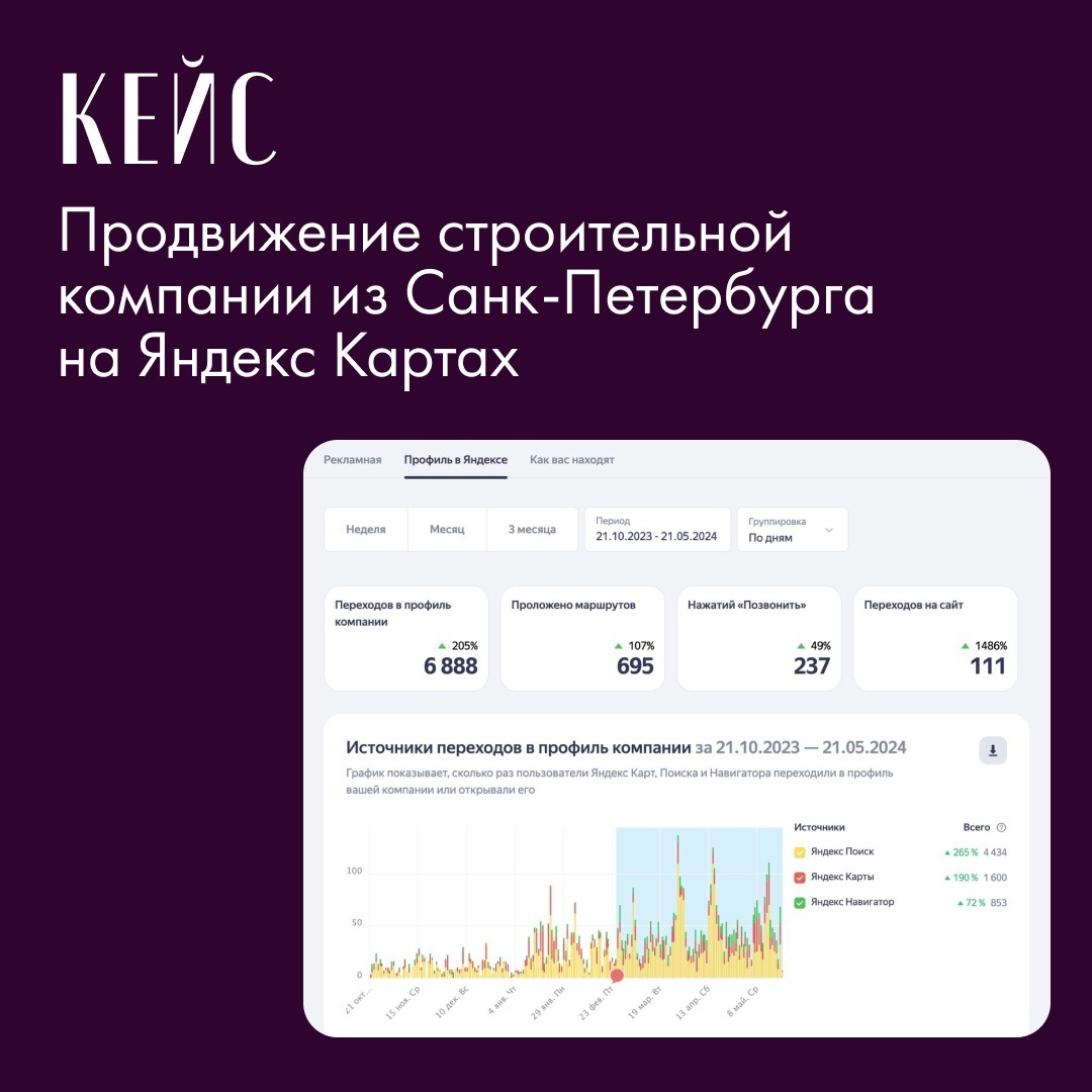 Делимся с вами результатами нашей работы по продвижению на Яндекс картах строительной компании из Санкт-Петербурга. До этого компания была зарегистрирована на Яндекс картах, но ее карточка была пустой и не оптимизированной под SEO. Что делали: И вот результат! Стоимость целевого действия: 73 рубля