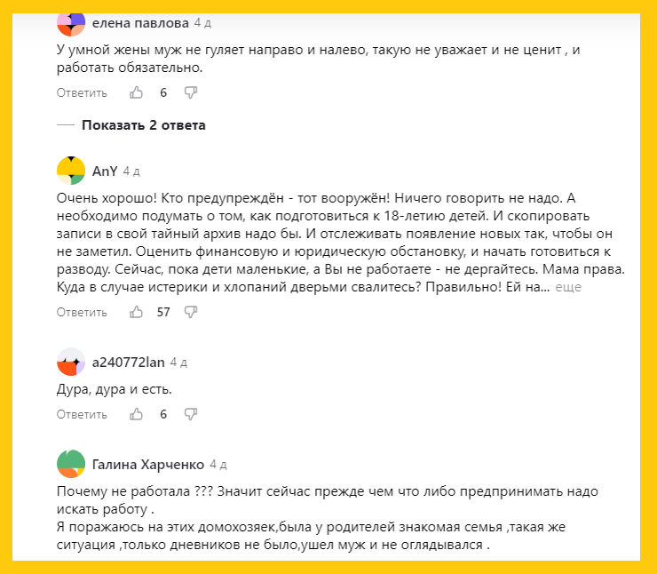 Да, я порой ведусь на завлекающие заголовки, простите. Думаешь - что ж там за тайник такой интересный, а там опять банальная измена. Скучно, девушки. Но вот что подумалось мне после прочтения десятка однотипных комментариев (там больше, но наверняка таких же): А как вы себе вообще это представляете? - подумала я. Ну вот, допустим, муж очень обеспеченный. Допустим, получает ЗП 1 миллион в месяц, да? А жена при этом устраивается... ну, уборщицей в "Пятёрочку", как презрительно пишут некоторые комментаторы, которые сами-то все сплошь инженеры-конструкторы в космической отрасли. На 20 тысяч рублей. Да ну ладно, допустим даже, что не уборщицей, а на обычную среднюю работу со средней ЗП - 50 тысяч. После института и всех положенных реверансов. И что? Да то, что по сравнению с доходами мужа это всё равно будут копейки. И что же будет постоянно слышать женщина в таком браке? Да известно что: "Зачем тебе это надо? Нам что - не хватает? Лучше бы детьми занималась, а то на этих нянь надежды нет