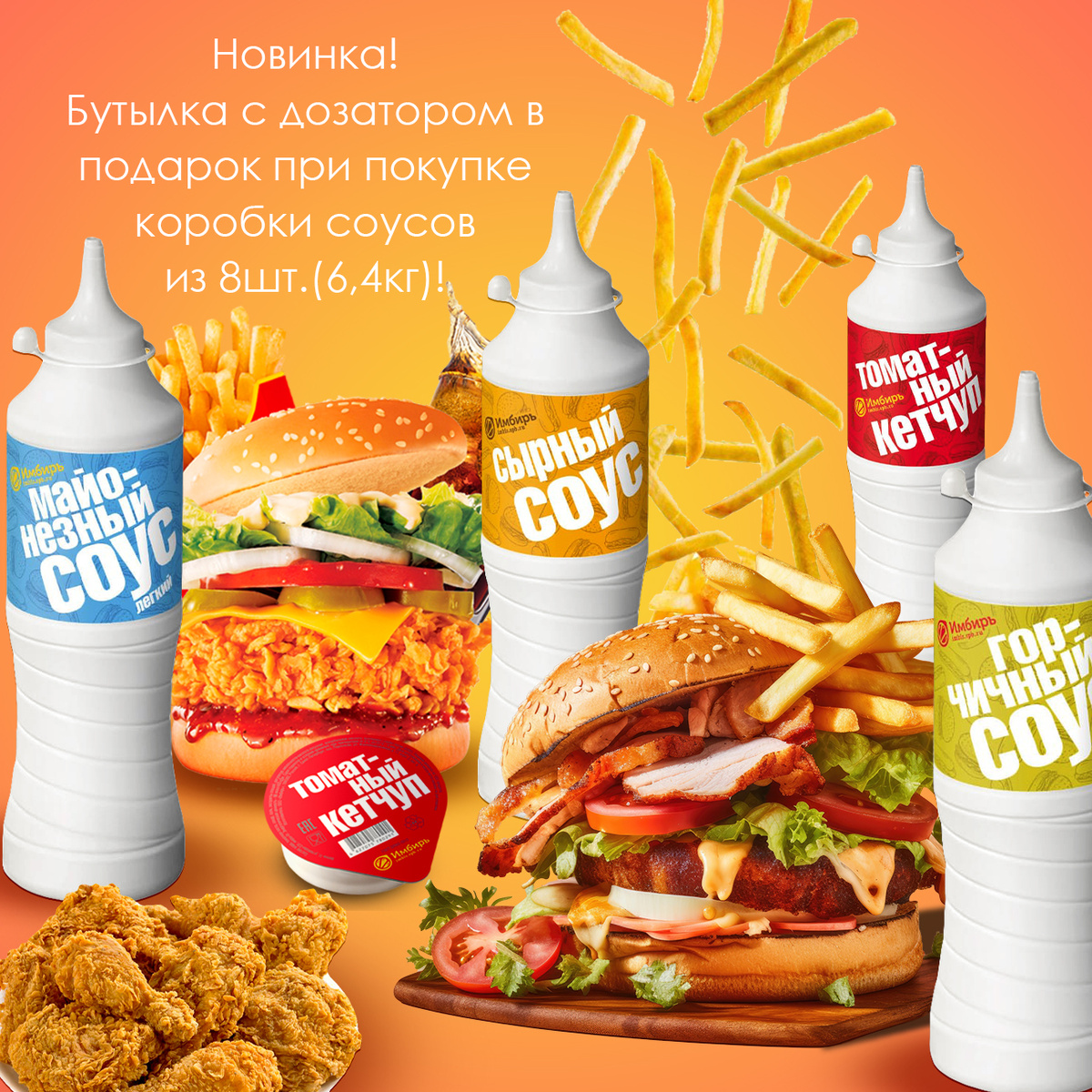 Отличное предложение для вашего бизнеса! Коробка с 8 пакетами соусов по 800 гр. и бутылка с дозатором в комплекте! Главные преимущества нашего предложения: Мы сделали соусы, которые не уступают по качеству существующим лидерам рынка. Мы придумали удобное решение для вашего бизнеса: в одной коробке 800 гр. *8 шт. = 6,4 кг. + стерильная бутылка в каждой коробке с удобным контрастным цветовым маркером под каждый вид соуса. Вы существенно экономите на упаковке при использовании, как на кухне, так и в полевых условиях. Плюс бутылка легко и быстро наполняется новым пакетом соуса без остатка, после чего пакет сразу утилизируется. Так как новая стерильная бутылка содержится в каждой коробке, ее не нужно мыть, а достаточно просто менять при открытии новой коробки. Для того чтобы получить консультацию, вы можете оставить заявку: