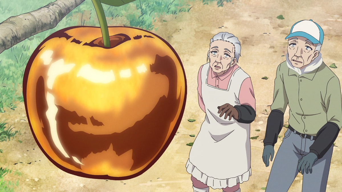 Это аниме, однако, преподнесло несколько сюрпризов. Я поговорю о них дальше по тексту, а сейчас охарактеризую это таким образом: произведение оказалось более эмоционально насыщенным, чем я предполагал. И несколько более широким в охвате своего повествования. Сейчас дам короткую вводную и разъясню подробнее (само собой, без спойлеров). Итак, престарелая пара Сайто живёт в деревенской местности на Хоккайдо и ухаживает за большим яблоневым садом. Они вместе уже больше 50 лет, и продолжают любить друг друга. Да, многое им уже не по силам, а медовый месяц давным-давно они так и не отпраздновали. Но высшие силы решили дать им новый шанс насладиться жизнью сполна: скушав необычное золотое яблочко с дерева, которое они посадили перед свадьбой, они проснулись в помолодевших лет на 60 телах! После чего их быт одновременно и заметно меняется, и продолжается в привычном русле. Как и заявлено, это базово комедия романтического характера, которую иногда даже хочется назвать повседневностью. Но автор