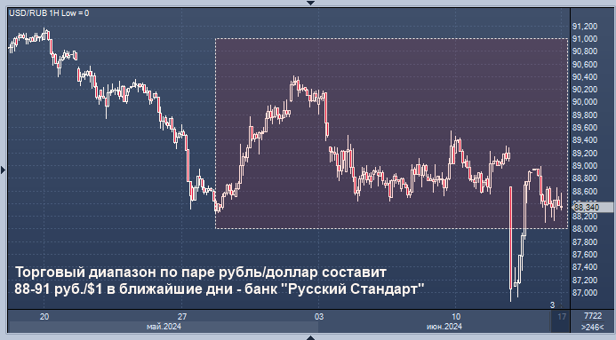 Торговый диапазон по паре рубль/доллар составит 88-91 руб./$1 в ближайшие дни - банк "Русский Стандарт" Торговый диапазон по паре доллар/рубль, скорее всего, составит в ближайшие дни 88-91 руб./$1, по паре с евро - 95-98 руб./EUR1, полагает директор департамента операций на финансовых рынках банка "Русский Стандарт" Максим Тимошенко. "На устанавливаемые Банком России валютные курсы в ближайшие дни способны оказать влияние нефтяные цены, геополитическая обстановка, продажи валюты в рамках бюджетного правила, - считает эксперт. - К этим факторам можно отнести и традиционный баланс российского импорта и экспорта. На фоне событий минувшей недели здесь возможно снижение спроса на валюту из-за перспектив уменьшения импорта. В ближайшие дни можно ожидать небольшую временную просадку курса национальной валюты. Однако слишком заметной волатильности курсов ЦБ по доллару и евро вероятно ожидать не придется, поскольку к подобному санкционному решению по Московской бирже российский регулятор по бол