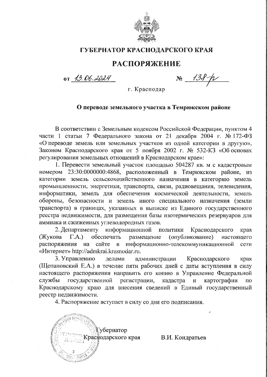 Соответствующие распоряжения на минувшей неделе подписал губернатор Краснодарского края Вениамин Кондратьев. - Перевести земельный участок площадью 504 287 кв.м с кадастровым номером 23:30:0000000:4868, расположенный в Темрюкском районе, из категории земель сельскохозяйственного назначения в категорию земель промышленности, энергетики, транспорта, связи, радиовещания, телевидения, информатики, земель для обеспечения космической деятельности, земель обороны, безопасности и земель иного специального назначения (земли транспорта) в границах, указанных в выписке из Единого государственного реестра недвижимости, для размещения базы изометрических резервуаров для аммиака и сжиженных углеводородных газов, - говорится в первом документе. На кадастровой карте данный участок имеет отметку «Для сельскохозяйственного производства». Кроме того, в ту же категорию переводят и землю с кадастровым номером 23:30:601000:5128 площадью 7 433 кв.м. На карте, пока еще, она имеет пометку «Для размещения полез