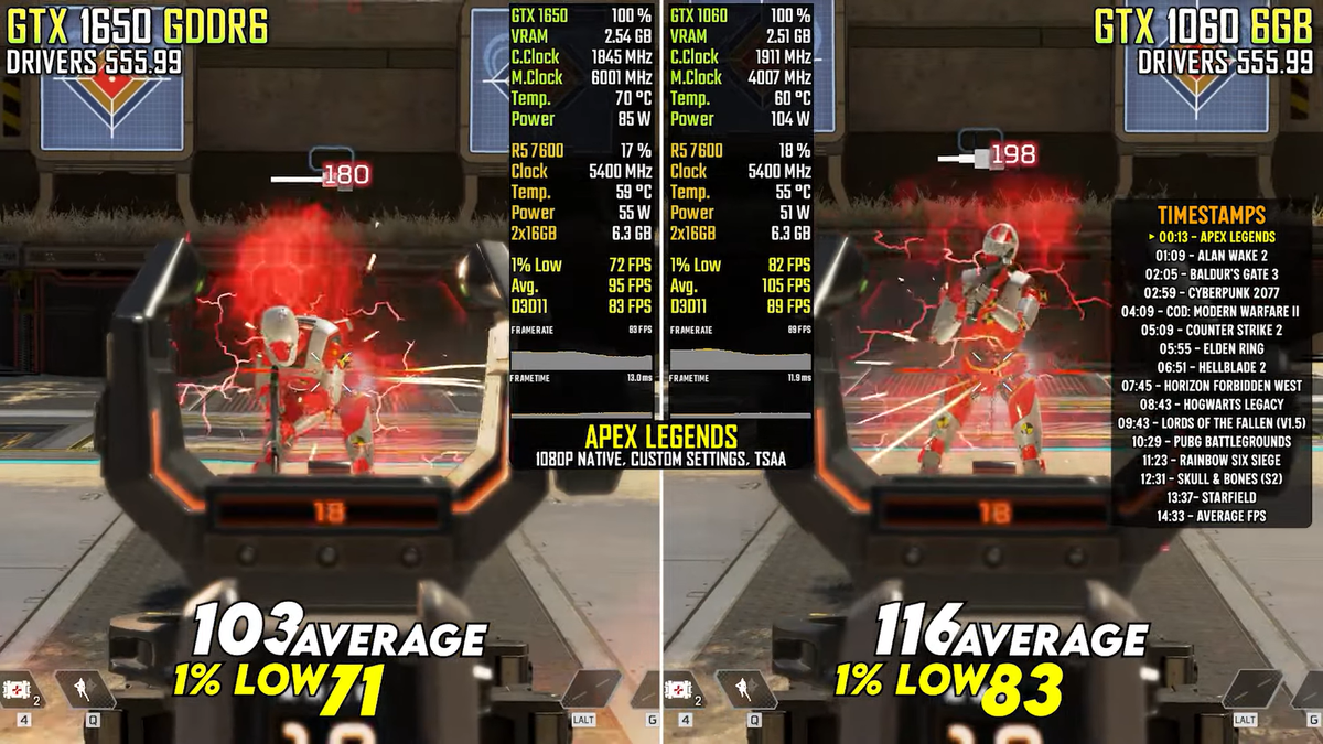 На YouTube-канале NJ Tech выяснили, какой производительности в среднем стоит ждать от GTX 1650 4 ГБ и GTX 1060 6 ГБ в современных проектах. COD Modern Warfare II запускалась с Native Resolution, пресетом Basic, SMAA. Средняя частота кадров в ней с GTX 1650 составляла 59 к/с, с GTX 1060 — 61 к/с. В игре Counter Strike 2 с Native Resolution, графикой Very High в среднем удалось получить 108 к/с (с GTX 1650) и 128 к/с (с GTX 1060). Hogwarts Legacy тестировалась с Native Resolution, на настройках графики Medium, TAA High. Средний FPS в этой игре составил 46 к/с (GTX 1650) и 44 к/с (GTX 1060). PUBG Battlegrounds шла с Native Resolution, пресетом Medium. Средняя производительность в игре равнялась 81 к/с (с GTX 1650) и 101 к/с (с GTX 1060). Starfield тестировалась с Xess U. Quality, пресетом Low. Средняя частота кадров в ней составляла 42 к/с и 38 к/с (GTX 1650 и GTX 1060 соответственно). С этими и другими результатами тестирования вы можете ознакомиться на видео ниже. В среднем во всех игра