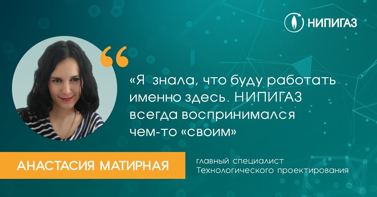 НИПИГАЗ имеет богатую историю. За годы работы здесь сформировалась не просто команда высококлассных профессионалов, но и целые трудовые династии. Главный специалист Технологического проектирования Анастасия Матирная пришла в профессию по стопам отца. Она выпускница Кубанского государственного технологического университета, одного из наших ключевых вузов-партнеров, с которым НИПИГАЗ связывает продолжительное сотрудничество.