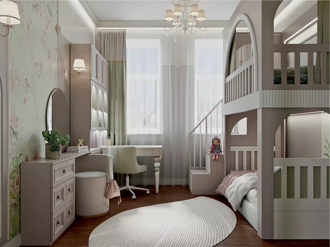 Элегантная дизайнерская мебель в комнату девочки с двухъярусной кроватью
