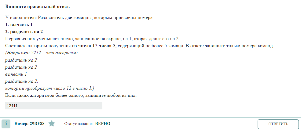 У исполнителя Раздвоитель две команды, которым присвоены номера: 1. вычесть 1 2. разделить на 2 Первая из них уменьшает число, записанное на экране, на 1, вторая делит его на 2. Составьте алгоритм получения из числа 17 числа 5, содержащий не более 5 команд. В ответе запишите только номера команд. (Например: 2212 –– это алгоритм: разделить на 2 разделить на 2 вычесть 1 разделить на 2, который преобразует число 12 в число 1.) Если таких алгоритмов более одного, запишите любой из них. РЕШЕНИЕ 1. 17, нельзя без остатка поделить на 2, вычитаем: 17-1=16 Команда 1 2. 16, можно без остатка поделить на 2: 16/2=8 Команда 2 3. 8, можно поделить на 2, но тогда получится число меньше 5, поэтому вычитаем: 8-1=7 Команда 1 4. 7, нельзя без остатка поделить на 2, вычитаем: 7-1=6 Команда 1 5. 6-1=5 - искомый результат Команда 1 Переписываем номера команд сверху вниз - 12111 (не больше 5 команд, как и необходимо по условию) ОТВЕТ 12111
