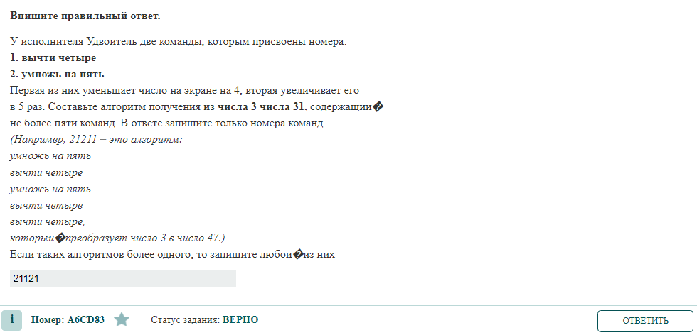 не более пяти команд. В ответе запишите только номера команд. (Например, 21211 –– это алгоритм: умножь на пять вычти четыре умножь на пять вычти четыре вычти четыре, который преобразует число 3 в число 47.) Если таких алгоритмов более одного, то запишите любой из них РЕШЕНИЕ Будем идти от числа 31 к числу 3 применяя противоположные команды, так мы будем видеть когда промежуточный результат можно без остатка поделить на 5. Тогда мы имеем команды: 1. Прибавь 4 2. Раздели на 5 1) 31 нельзя без остатка поделить на 5, прибавим: 31 + 4 = 35 Команда 1 2) 35 можно без остатка поделить на 5: 35 / 5 = 7 Команда 2 3) 7 нельзя без остатка поделить на 5, прибавим: 7 + 4 = 11 Команда 1 4) 11 нельзя без остатка поделить на 5, прибавим: 11 + 4 = 15 Команда 1 2) 15 можно