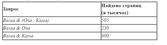 В языке запросов поискового сервера для обозначения логической операции «ИЛИ» используется символ «|», а для обозначения логической операции «И» –– символ «&». В таблице приведены запросы и количество найденных по ним страниц некоторого сегмента сети Интернет. Какое количество страниц (в тысячах) будет найдено по запросу Волга & Ока & Кама? Считается, что все запросы выполнялись практически одновременно, так что набор страниц, содержащих все искомые слова, не изменялся за время выполнения запросов. РЕШЕНИЕ Изобразим на диаграмме имеющиеся данные: Отметим область, которую нужно найти: Волга И Ока + Волго И Кама - Волга И Ока И Кама = Волга И (Ока ИЛИ Кама) Волга И Ока И Кама = Волга И Ока + Волго И Кама - Волга И (Ока ИЛИ Кама) = 230 + 400 - 505 = 125 ОТВЕТ 125