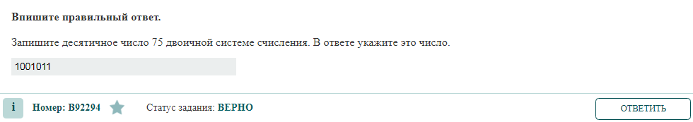 Запишите десятичное число 75 двоичной системе счисления. В ответе укажите это число. ЧТО НУЖНО ЗАПОМНИТЬ? Правила перевода из десятичной системы счисления в двоичную С помощью деления на два. 1. Последовательно выполнять деление исходного целого десятичного числа и получаемых целых частных на 2. 2. Записать полученные остатки в обратной последовательности. Пример: Переведем число 105 из десятичной системы счисления в двоичную: 105/2=52 (ост. 1) 52/2= 26 (ост. 0) 26/2=13 (ост. 0) 13/2= 6(ост. 1) 6/2= 3(ост. 0) 3/2 = 1(ост. 1) 1/2= 0 (ост. 1) Переписываем снизу вверх 105₁₀ = 1101001₂ РЕШЕНИЕ 75/2=37 (ост. 1) 37/2= 18 (ост. 1) 18/2=9 (ост. 0) 9/2= 4(ост. 1) 4/2= 2(ост. 0) 2/2 = 1(ост. 0) 1/2= 0 (ост. 1) Переписываем снизу вверх 75₁₀ = 1001011₂ ОТВЕТ 1001011