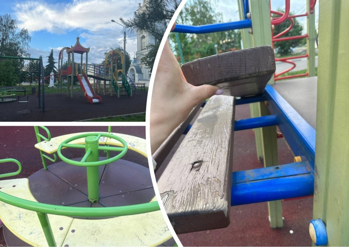 Работы по обустройству здесь детского пространства проводились в 2021 году, на них потратили 8 миллионов. Устанавливали не только детские аттракционы, но также укладывали плитку и оборудовали освещение. Спустя три года жители заговорили о проблемах. «У Яковлевской церкви есть прекрасная детская площадка! Но почему-то одни качели очень давно отсутствуют. Теперь еще и карусель сломана. И дощечка тоже давно не прикреплена, благо еще лежит», - описал текущую ситуацию посетительница детской площадки. Подтверждают сказанное фотографии: один из брусков, составляющих сиденье на качелях, явно не закреплён. Оценить, в рабочем ли состоянии карусель, в статике не выйдет. Но даже на вид она выглядит не совсем пригодной. «Огромная просьба привести в порядок детскую площадку», - заключила автор обращения, размещенного в соцсетях у Михаила Евраева.