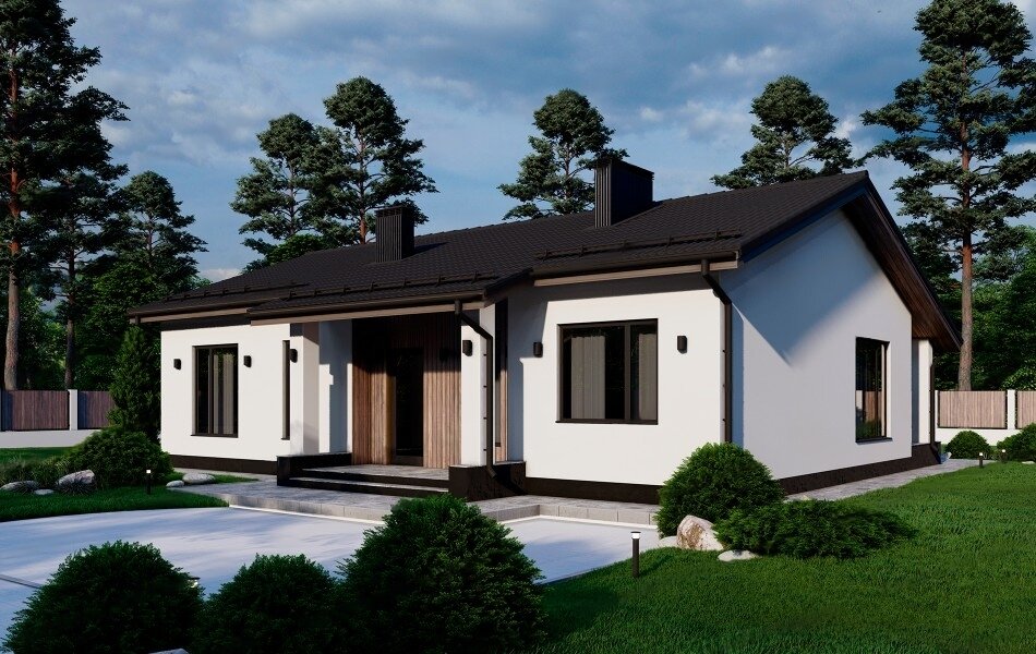 Проект А24 представляет собой современный одноэтажный дом, идеально подходящий для небольшой семьи. Данный проект разработан с учетом всех современных потребностей жителей, предлагая уютное и продуманное пространство для жизни. Внешний вид и отделка Отделка дома — светлая штукатурка в сочетании с планкеном, это придает зданию уютный и привлекательный вид. Крыша дома покрыта металлочерепицей, которая защищает от непогоды и обладает высокой устойчивостью к износу. Большие окна и стеклянные двери на террасу обеспечивают максимальное проникновение естественного света внутрь дома, создавая светлую и просторную атмосферу. Планировка Основные помещения 1) Гостиная (31,17 м²) Просторная и светлая гостиная с обеденной зоной, объединенная с кухней, создает открытое пространство, идеальное для семейных мероприятий и встреч с друзьями. В гостиной предусмотрен выход на террасу, что обеспечивает дополнительное пространство для отдыха и развлекательных мероприятий. 2) Кухня (13,66 м²) Удобная и функ