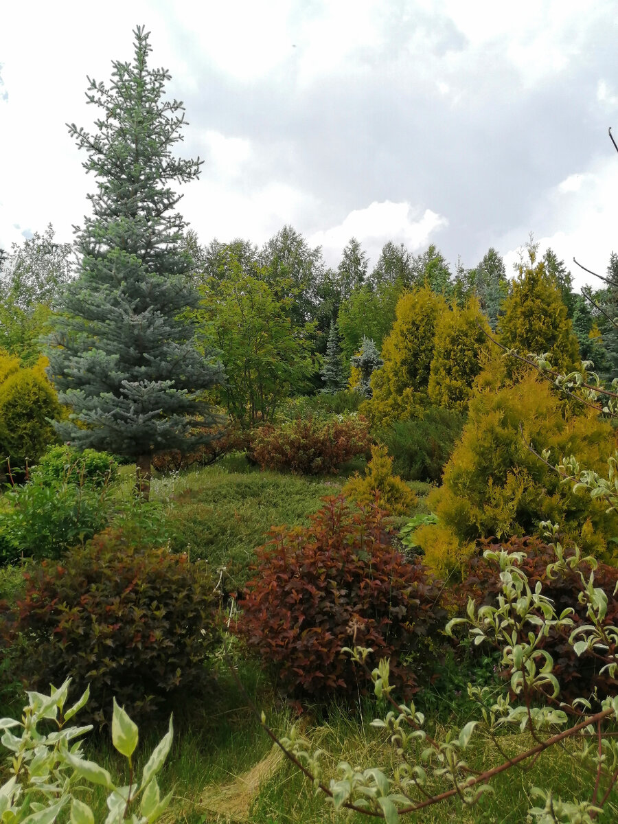 Дендрарий "Алтайское Холмогорье", расположенный неподалеку от села Алтайское, существует около 20 лет. Лучше всего туда попадать, когда посетителей минимум - территория не очень большая, забетонированные дорожки довольно узкие, да и вообще лично я в подобных местах очень ценю отсутствие народа. Может быть, поэтому первый раз от посещения дендрария у меня остались смешанные впечатления - не повезло, и по нему ходили буквально толпы. А вот в это воскресенье - почти никого. И дождь, хоть и пытался несколько раз начаться, всерьез накрыл уже перед отъездом, при покупке растений. И у нас получилось даже подняться повыше, туда, где скорее не экспозиция, а что-то типа ландшафтного парка. Хотя после дождя там не везде можно нормально пробраться - дорожки просто покрыты травой, а иногда и ее нет. Зато как там красиво... Меня, на самом деле, восхищает подход хозяев дендрария. Даже там, где еще сохраняется исходная растительность, добавление ярко окрашенных растений совершенно меняет пейзаж. А тут