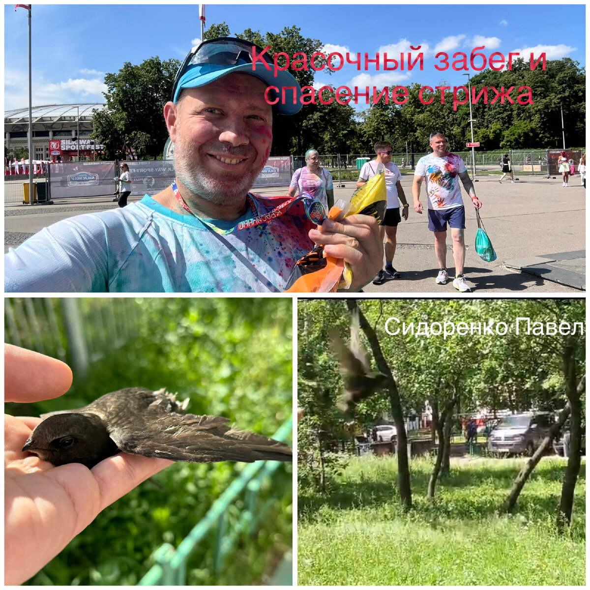 Просыпаюсь чуть с запозданием, хватаю вещи и мчу на такси на красочный забег. Выбегаю из дома, лечу к остановке. Бац, ворона в кустах кого то клюет. Останавливаюсь, птичка, живая. Отгоняю ворону и беру в руки птицу. Вцепляется мертвой хваткой. Несу домой, отменяю такси, которое уже приехало. Через Chat GPT пробиваю птицу по фотке - стриж. Дома в коробку убираем стрижа и ставим в ванной. Вроде ничего так, живой! Оставляю рюкзак и экшн-камеру дома, так как могу не успеть сдать вещи в камеру хранения, и вызываю такси. Мчу на забег. До старта час… Успеваю! Даже с коллегами и друзьями сфоткался и чутка размялся. Встал в сектор С, чтобы не мешать быстрым бегунам. Слышу знакомые фамилии претендентов: Дмитрий Неделин, Елена Калашникова и другие. Мысленно желаю удачи! Это люди, которые мотивируют бегать. Старт красочного забега! Моя волна третья. Кластер С. Бежим! Точнее идём, причём минут по семь. А я по 04:05/15 рассчитывал на темп. Ухожу на обочину. Толпа идёт, приходи