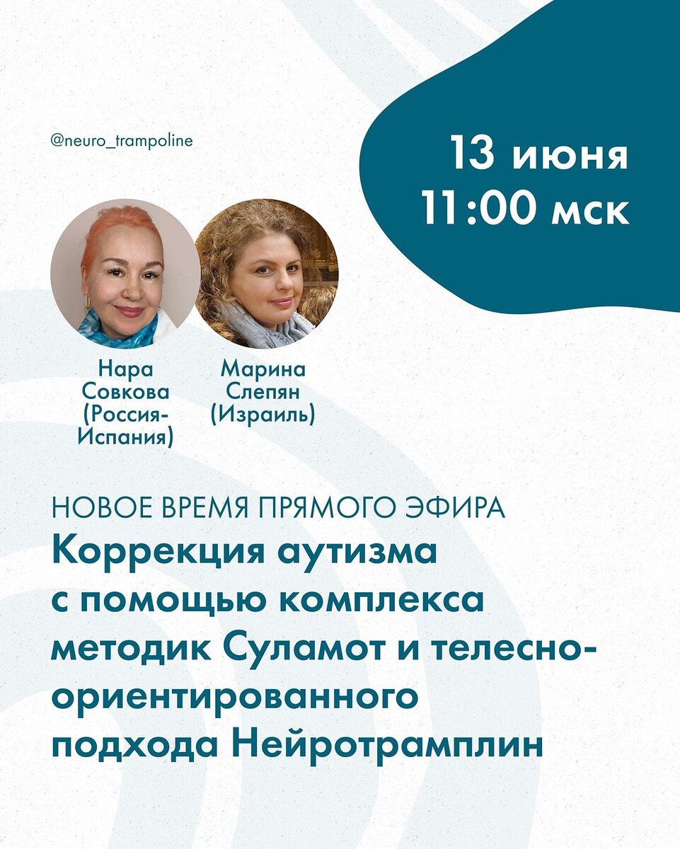 Приглашаю на бесплатный прямой эфир: Нара Совкова (Россия - Испания) — Марина Слепян (Израиль)! Тема эфира: Коррекция аутизма с помощью комплекса методик Суламот и телесно-ориентированного подхода Нейротрамплин. Внимание! Дата и время изменились: 13 июня, 11.00 мск. Марина — Executive MBA (Bradford University, UK), выпускница педагогического факультета Тель-Авивского Университета по программе «Специалист по построению индивидуальной инклюзии в общем образовании для детей с аутизмом» и колледжа им. Давида Елина по специальности «Помощь семьям, воспитывающим детей с РАС в создании коррекционно-развивающей среды». Марина также окончила двухгодичный курс повышения квалификации по КПТ (когнитивно-поведенческой терапии) и помогает семьям и специалистам.