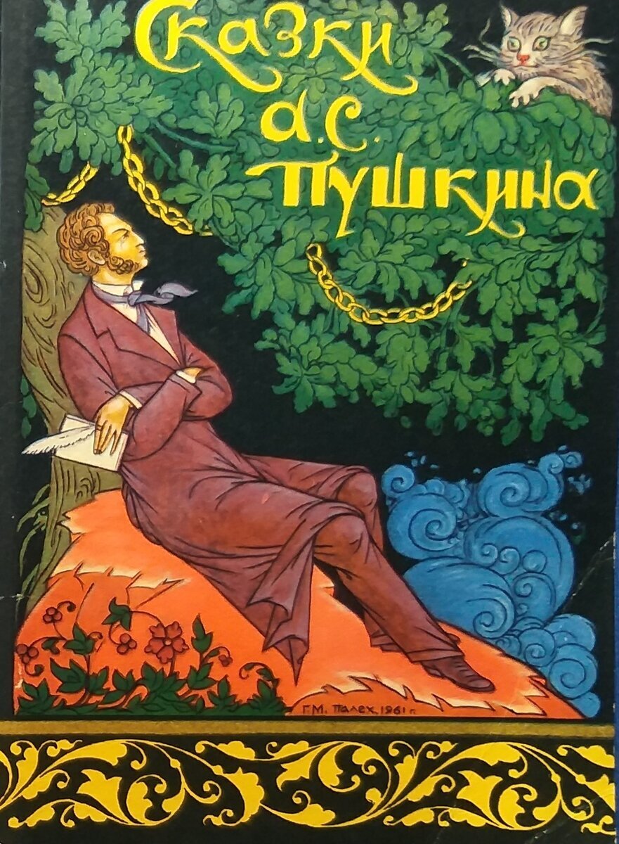 Много-много лет назад, в моём детстве, был у меня набор открыток – иллюстраций к сказкам А.С.Пушкина, выполненных палехскими художниками, с такой вот симпатичнейшей обложкой (совсем недавно, к своей радости, обнаружила воспроизведение в интернете):