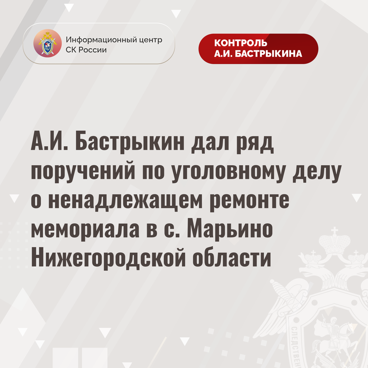 А.И. Бастрыкин дал ряд поручений по уголовному делу о ненадлежащем ремонте мемориала в с. Марьино Нижегородской области