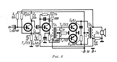 - с помощью резистора R6-подстроечного настраивают УНЧ в режим на грани возникновения самовозбуждения, т.е. усилитель только только "запищал". Если самовозбуждения не возникает вообще, то меняют местами концы обмотки I трансформатора Тр1 (с заводскими устройствами такого чаще всего не бывает)