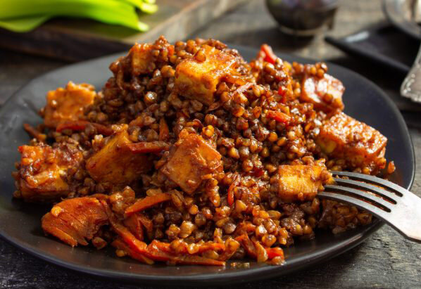 Этот вегетарианский рецепт от Жанны Кужевой может сытно накормить семью без всякого мяса благодаря сбалансированному составу продуктов. Ингредиенты: 180 г гречневой крупы, 200 г тофу (без добавок с нейтральным вкусом), 1 луковица, 1 морковь, 1 зубчик чеснока, 3 ст. л. томатного пюре (или томатный соус), 1\2 чайной ложки аджики, 1 ст. л. соевого соуса, растительное масло без запаха для жарки, 2 ст. л. пшеничной муки, соль, черный и красный перец. Готовим овощи В сковороду наливаем 2 ст. л. растительного масла и нагреваем. Большую луковицу режем кубиками, зубчик чеснока измельчаем, высыпаем все в разогретое масло и обжариваем 5 минут на среднем огне. Затем добавляем морковь, нарезанную тонкой сломкой, и обжариваем овощи на среднем огне 7-8 минут, пока морковь не станет мягкой. Чтобы овощи поджарились равномерно и не пригорели, постоянно помешиваем. «Колдуем» с тофу Тофу нарезаем кубиками со стороной 1,5-2 см. В тарелку насыпаем муку, выкладываем в нее нарезанный тофу и обваливаем кусочки