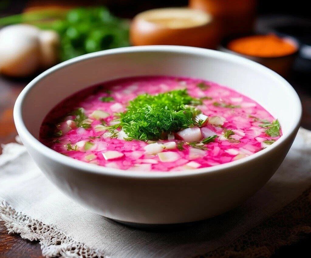 Свекольник на хлебном квасе — это холодный суп, традиционный для русской кухни, идеально подходящий для летней жары. Освежающий и легкий, он сочетает в себе насыщенный вкус свеклы, ароматный хлебный квас и свежие овощи. Этот суп не только вкусен, но и полезен, так как содержит много витаминов и микроэлементов. Приготовление cвекольника на хлебном квасе пошагово Ингредиенты (на 4 порции) Свекла (свежая) — 400 г Огурцы (свежие) — 200 г Картофель — 300 г Редис — 100 г Зеленый лук — 50 г Укроп — 30 г Яйца (вареные) — 4 шт. Хлебный квас — 1 литр Сметана — 100 г Соль — по вкусу Сахар — по вкусу Лимонный сок — по вкусу (опционально) Калорийность (на 100 г) Подготовка ингредиентов Приготовление Этот освежающий суп идеален для летнего обеда или ужина. Свекольник на хлебном квасе готов. Приятного аппетита!