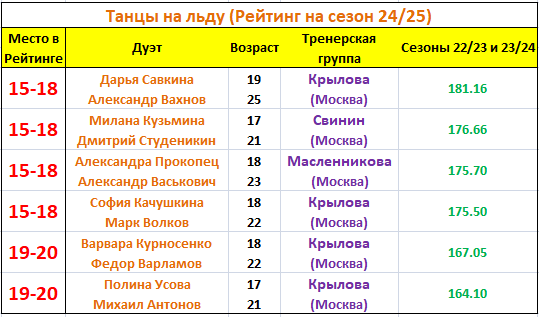 Здесь мы видим большую группу дуэтов, которым по моим раскладам предстоит борьба за последнее 15-е вакантное место на Чемпионат России 2025. Сразу 4 дуэта представляют группу Анжелики Крыловой. Топ-14 просматривается достаточно четко, о чем пойдет речь чуть ниже, а вот на 15 место в равной степени претендуют сразу 4 пары. Если смотреть на баллы прошедшего сезона, а они безусловно имеют значение, то чуть выше шансы Даши Савкиной/Александра Вахнова и новичков взрослого сезона Миланы Кузьминой/Дмитрия Студеникина.