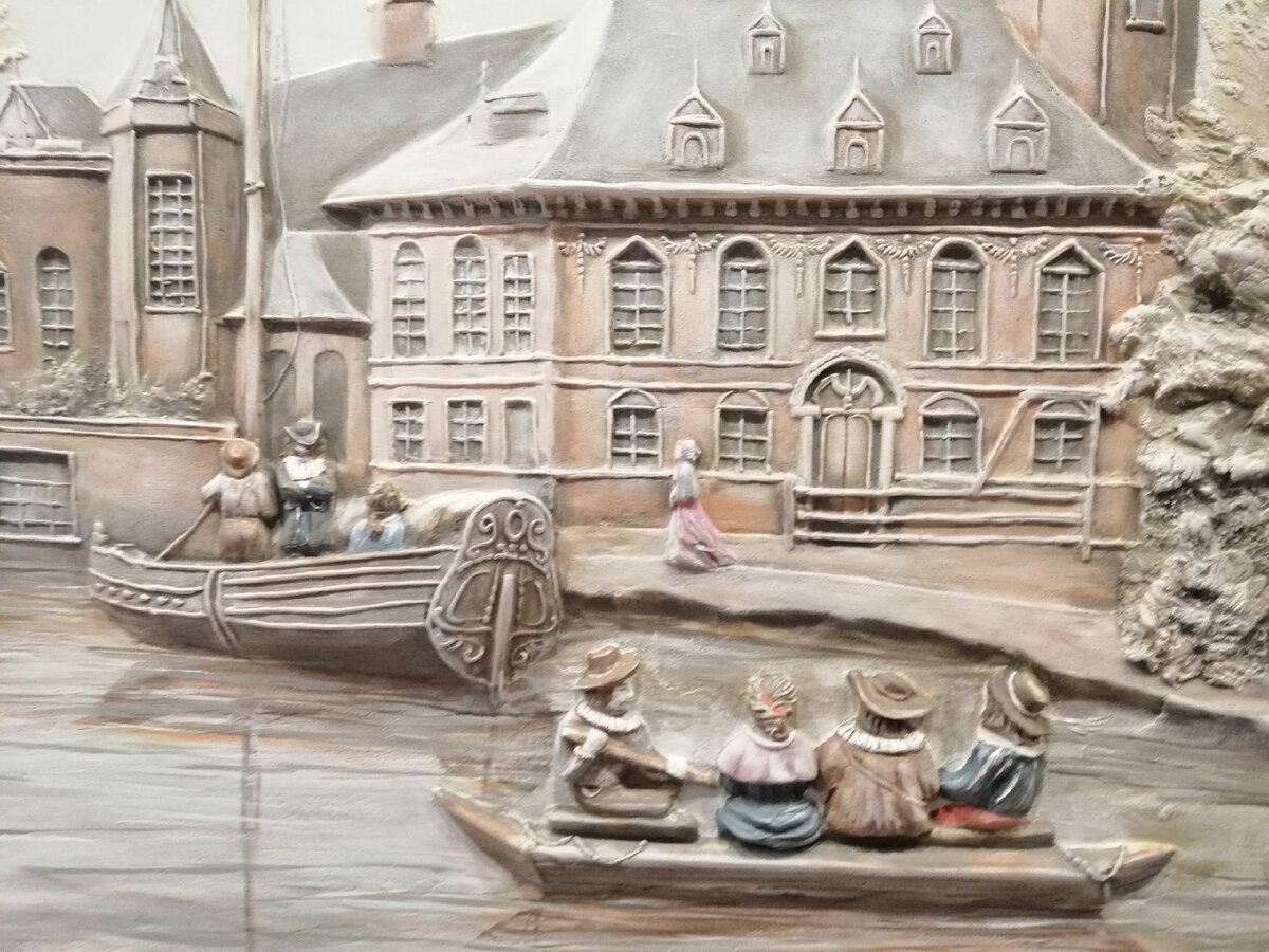 Как и обещала, рассмотрю этапы работы над этим барельефом. Обзор готового заказа я делала здесь. Можете переходить по ссылке, кто не видел. В этой статье я уделю внимание деталям и особенностям создания этого барельефа. Когда меня пригласили, ниша имела вот такой вид. Правда, это самое ранее фото, и на нём уже видно начало моей работы. Я не знаю, какую функцию должна была выполнять эта ниша, по замыслу её создателей. Она не достаточно глубокая, чтобы поставить в ней что-то значительное, к ней не подведена проводка, чтобы сделать зоной ТВ. Видать, когда стоили дом, ниши были в моде. На первом фото видно начало работы, как всегда, с отрисовки эскиза на стене. Обычно я начинаю создавать гипсовые формы с самых толстых слоёв. На сей раз это были стволы и ветви деревьев ближнего плана, а также здания. С лодками всегда приходиться думать и ломать голову, чтобы найти оптимальную толщину, которая не должна выходить за пределы общего объёма, но и должна быть достаточной, чтобы показать перспект