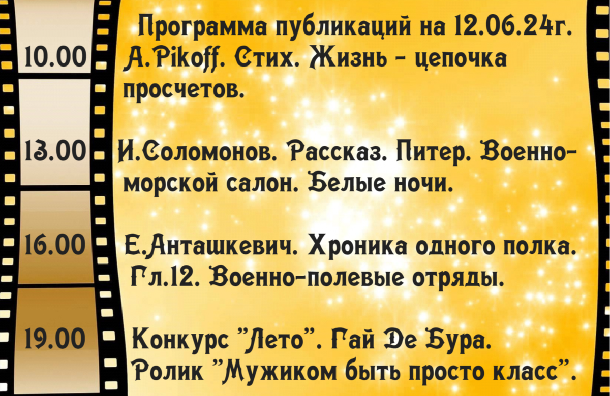 1. Программа публикаций 2. Лучшее из архива, набравшее большое количество просмотров и дочитываний. - 35К дочитываний. - "Балтийцы не плачут, балтийцы мстят" Рассказ о взаимовыручке курсантов училища подводного плавания в конфликте с представителями других республик бывшего СССР. - 1.2К просмотров - "Будни связиста" юмористический ролик о нелегкой работе связистов в армии. 3. Праздники С Днем России! Мира, тепла, добра, радости и света всем нам! Пусть каждый день начинается с хороших новостей и радостных событий. Пусть будет много достижений в области науки и культуры. Пускай самыми ценными качествами остаются милосердие и человечность!