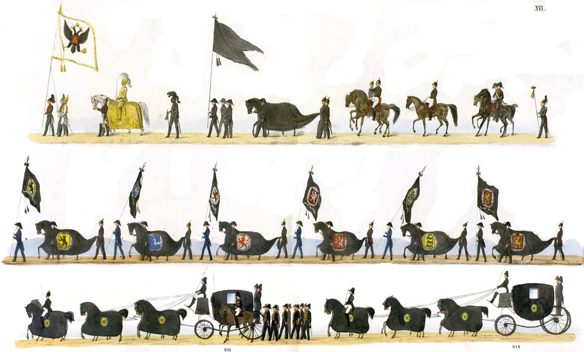 Представьте себе, например, печальную процессию прощания с императором Николаем Павловичем. Все убиты горем, все одеты в траур, кроме одного – унтер-шталмейстер Гарниш занимал свое место в процессии, разодетый в позолоченный рыцарский доспех. В описании церомонии прощания с императором его описали так: «… Латник в позолоченных латах с обнаженным мечом, с белыми перьями на шлеме – унтер-шталмейстер Гарниш. Лошадь в богатом чепраке и к нему принадлежащем уборе, ведомая двумя конюхами в парадных ливреях…» Интересно, а зачем в траурной церемонии прощания с Николаем I находился разодетый в позолоченное рыцарь? Более того, и Александра II, и Александра III тоже провожал одетый в аналогичный наряд придворный: «…Внимание народа привлекали и латники, которые двигались в конце третьего отделения между знаменами и гербами. Один ехал на коне, весь в золоте: латы, наколенники, наручники, шлем со страусовыми перьями, в руках обнаженный меч. Другой пеший латник – печальный, весь в черном уборе, с огр