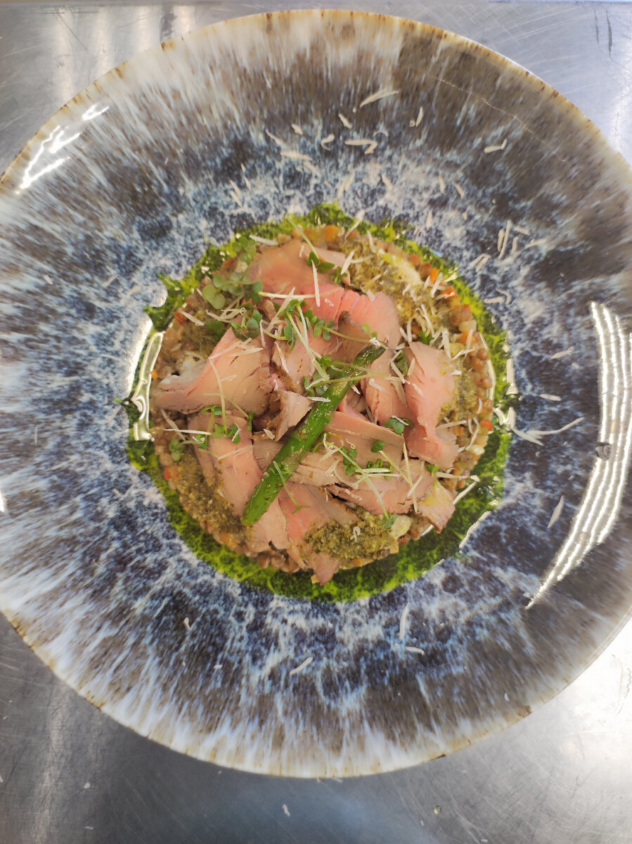 Говяжья вырезка с ложным ризотто из гречки с грибами и грибным соусом. С добавлением пасты из кинзы и мяты. Украшенный зеленым маслом.