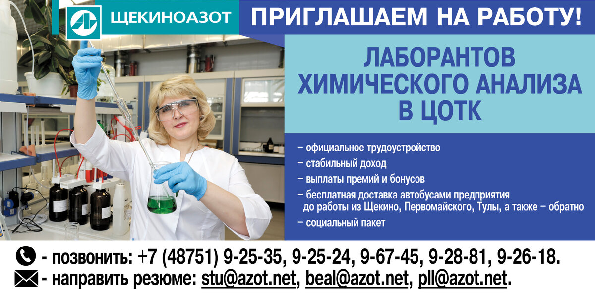В Централизованный отдел технического контроля АО «Щекиноазот» требуются лаборанты химического анализа.