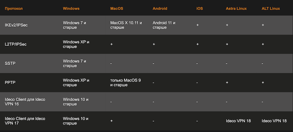 Ideco VPN поддерживает как старые VPN-протоколы для совместимости, так и современные безопасные протоколы. В таблице показаны поддерживаемые протоколы, как нативные IKEv2, L2TP, IPsec, SSTP, PPTP, так и проприетарный протокол Ideco-клиента, в основе VPN-туннеля которого лежит WireGuard, но с авторизацией и некоторыми другими возможностями. В 2024 г. появятся агенты для macOS, а также для отечественных операционных систем Astra и Altium.
