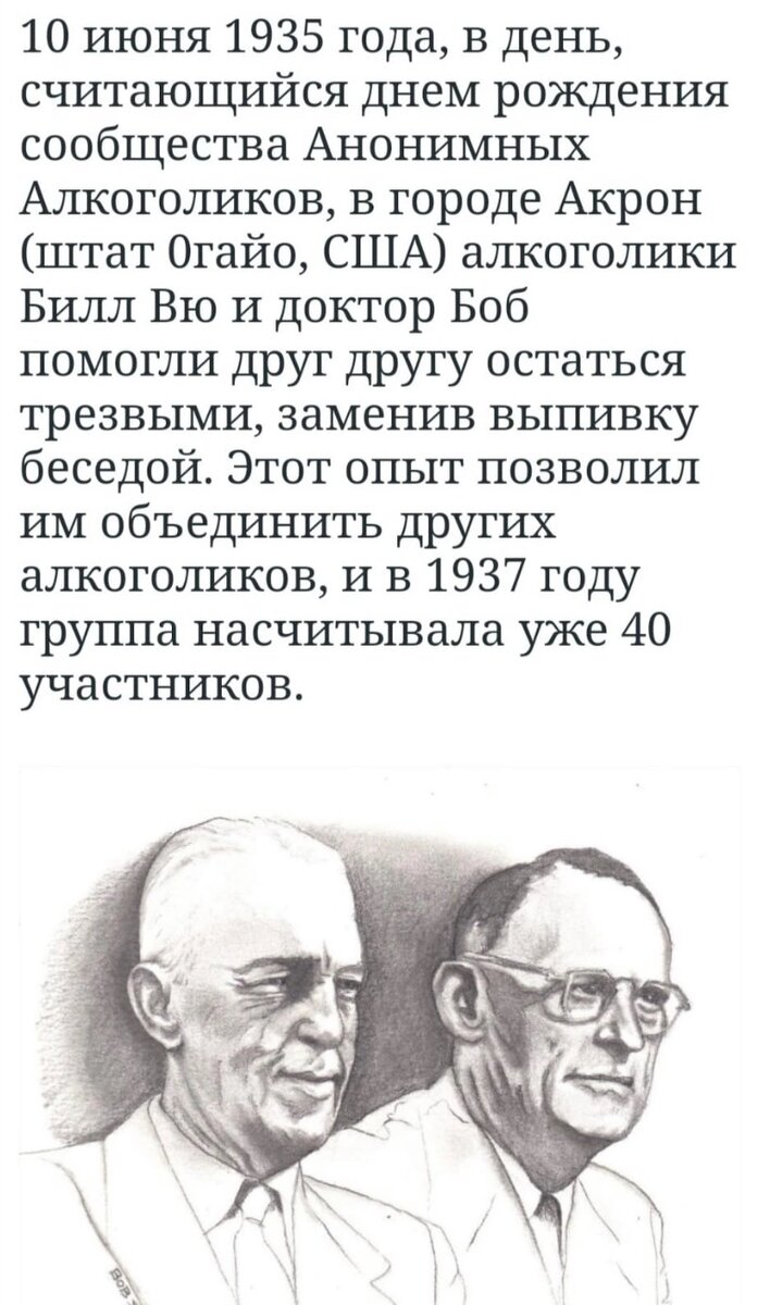 10 июня 1935 года, в день, считающийся днем рождения сообщества Анонимных Алкоголиков, в городе Акрон (штат 0гайо, США) алкоголики Билл У. и доктор Боб помогли друг другу остаться трезвыми, заменив выпивку беседой. Этот опыт позволил им объединить других алкоголиков, и в 1937 году группа насчитывала уже 40 участников. Со временем, когда количество людей стало чуть больше сотни и все они удивительным образом сохраняли трезвый образ жизни, при отсутствии какого либо медицинского вмешательства, их истории стали собирать в книгу. Так на свет появилась Большая или Синяя книга АА. Где изложены 12 шагов для выздоровления, принципы и традиции сообщества а также личные истории выздоровления, так называемой первой сотни алкоголиков, которой помогли эти шаги. В декабре 1938 года был разработан подробный текст "12 шагов": 1. Мы признали, что мы бессильны перед алкоголем, признали, что мы потеряли контроль над собой. 2. Пришли к убеждению, что только Сила более могущественная, чем наша собствен