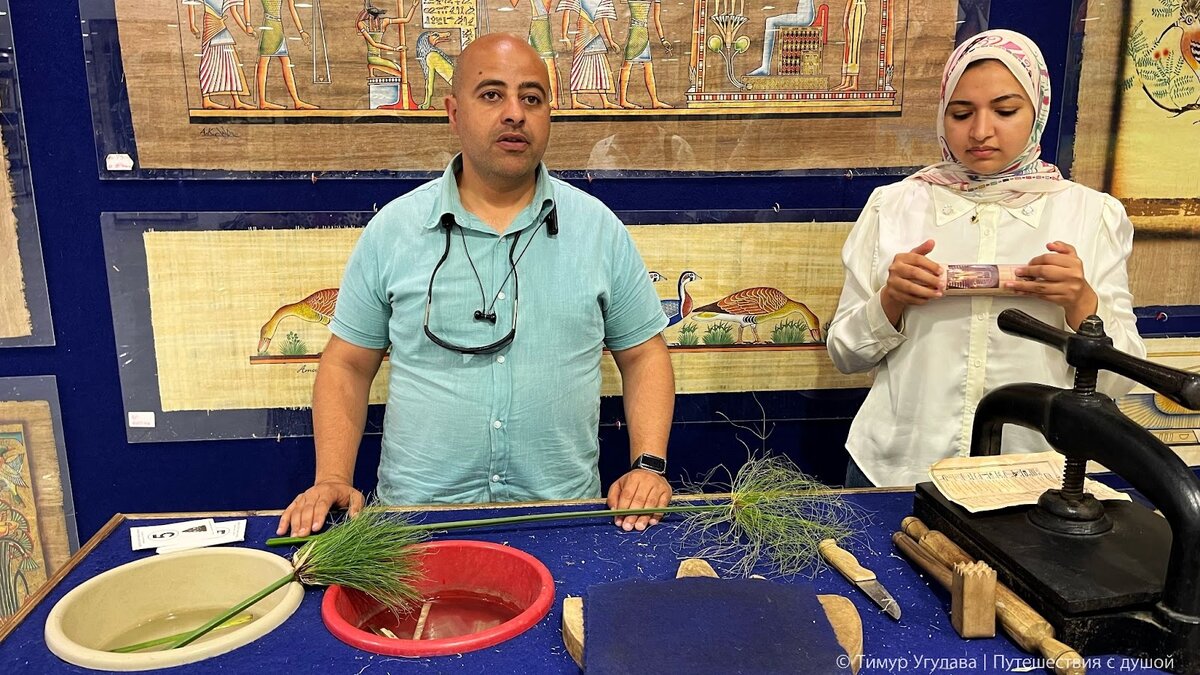 Показала процесс, как изготавливается папирус: берутся стебли осоки, нарезаются тонкими слайсами, прессуются и склеиваются вместе за счёт естественного клеящего состава. Шоу вышло коротким, но интересным. Собственно, в сети гуляют записи этой демонстрации десятилетней давности. Вот уж точно не удивлюсь, если эта схема работала ещё со времён фараонов…
