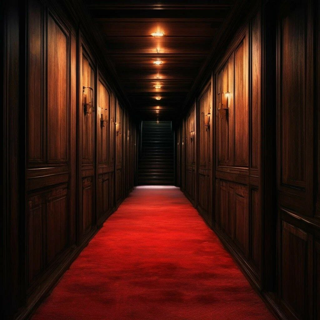 Я впервые рассмотрел детали коридора. Ковер был тускло бордового цвета, а стены - из дешевых деревянных панелей. По бокам висели тусклые лампочки.