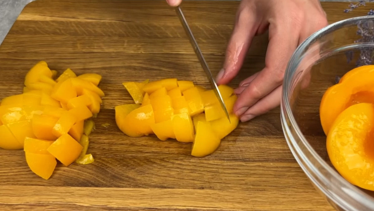 Рецепт может и не супер современный, но от этого не менее вкусный. Недавно готовила эту вкуснятину для своих великовозрастных деток и даже вечно сидящие на диете невестки лопали с удовольствием. Сразу оговорюсь что персики мы будем использовать консервированные, может быть кто то для этого десерта использует натуральные, но боюсь это уже другой рецепт. Итак меньше слов больше дела. Продукты: Банка консервированных персиков -850 гр. Сгущенное молоко -300 гр. Сливки от 30% и выше – 500 мл (не использовать комнатной температуры ! Хорошо охладить в холодильнике, но не замораживать!) Желательно иметь эл. миксер и измельчитель(блендер), хотя при желании можно воспользоваться и ручными их заменителями. Для начала нам нужно измельчить персики. Режем их на кусочки Складываем кусочки в блендер и превращаем в персиковое пюре Теперь наша задача максимально убрать жидкость из пюре. Удобно это делать с помощью мелкого ситечка Соединяем пюре и сгущенку, хорошо перемешиваем между собой. Теперь очень о