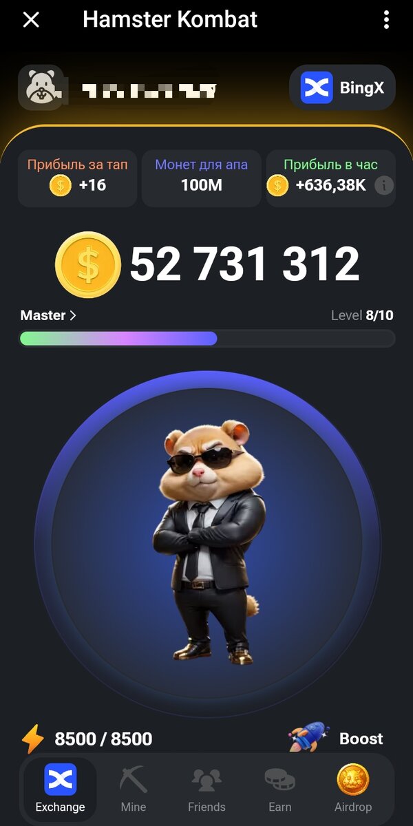 На первом этапе ваше «управление биржей» сводится к тапам по хомяку. Так вы и зарабатываете монетки. Сначала один тап приносит одну монетку, но эффективность можно прокачивать. Также необходимо следить за энергией, она тратится от нажатий на экран. Для ее восстановления, а также для временного увеличения заработанных за клик монет необходимо покупать бусты.